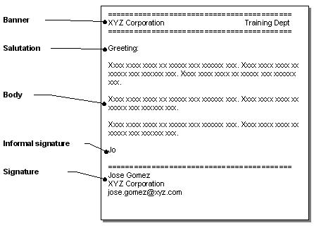 BannerLike the letterhead of a memo or letter, the banner immediately identifies the source of the message. The banner is optional. Many e-mail programs do not automatically insert a banner although all let the user paste in one if only a text one. Use the banner to immediately identify the source and nature of the message. They can give a distinctive identity to messages related to the course, messages from you, or messages of a specific nature, such as warnings. Keep the banner short so it does not push the body of the message into the next scrolling zone. SalutationIn unsolicited e-mail, begin by explaining who you are and your interest in the recipient. Explain why you are writing to this particular individual. Begin with a neutral greeting.